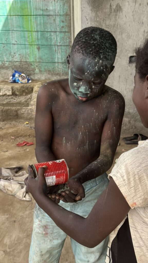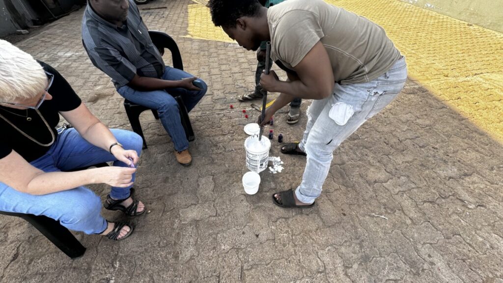 Alles gaat in Afrika anders dan hier in het westen, en met een tempo wat wij niet zijn gewend. Zo sta je een hele morgen in een winkel om inkopen te doen zoals verf. Deze wordt nog buiten op de stoep gemengd d.m.v. kleine flesjes kleurstof bij witte verf te voegen. Wanneer de witte verf nog niet echt veranderd is en er al meer dan 10 flesjes in de pot verf gegaan zijn kom je er achter dat alle kleurstof naar beneden is gezakt en niet in de pot witte verf is beland. Ach, je neemt genoegen met het feit in Afrika te zijn en we hebben samen terpentine (het was afneembare verf) in de flesjes gegoten en de kleurstof gemengd met de pot witte verf totdat we in de buurt kwamen van de kleur die we graag wilde.