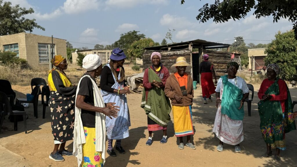 Als eerste hebben we samen gezongen, een stukje evangelie gebracht en daarna allemaal een Held pakketje gegeven met sokken, ondergoed en wat lekkers. In Zuid-Afrika is het namelijk nu winter en kan het in de nacht wel rond de 10 graden worden. Een paar warme sokken zijn dan wel aangenaam. Daarna zijn we naar een groep ouderen in de buurt gegaan die ondanks hun lichamelijke klachten en uitzichtloosheid elke dag bij elkaar komen om te zingen, dansen en socializen waarna ze een warme maaltijd samen eten. (De “keuken” is gegeven door Tshega). We hebben samen gezongen, gedanst en aan het einde voor ze gebeden aan de hand van een firetunnel.