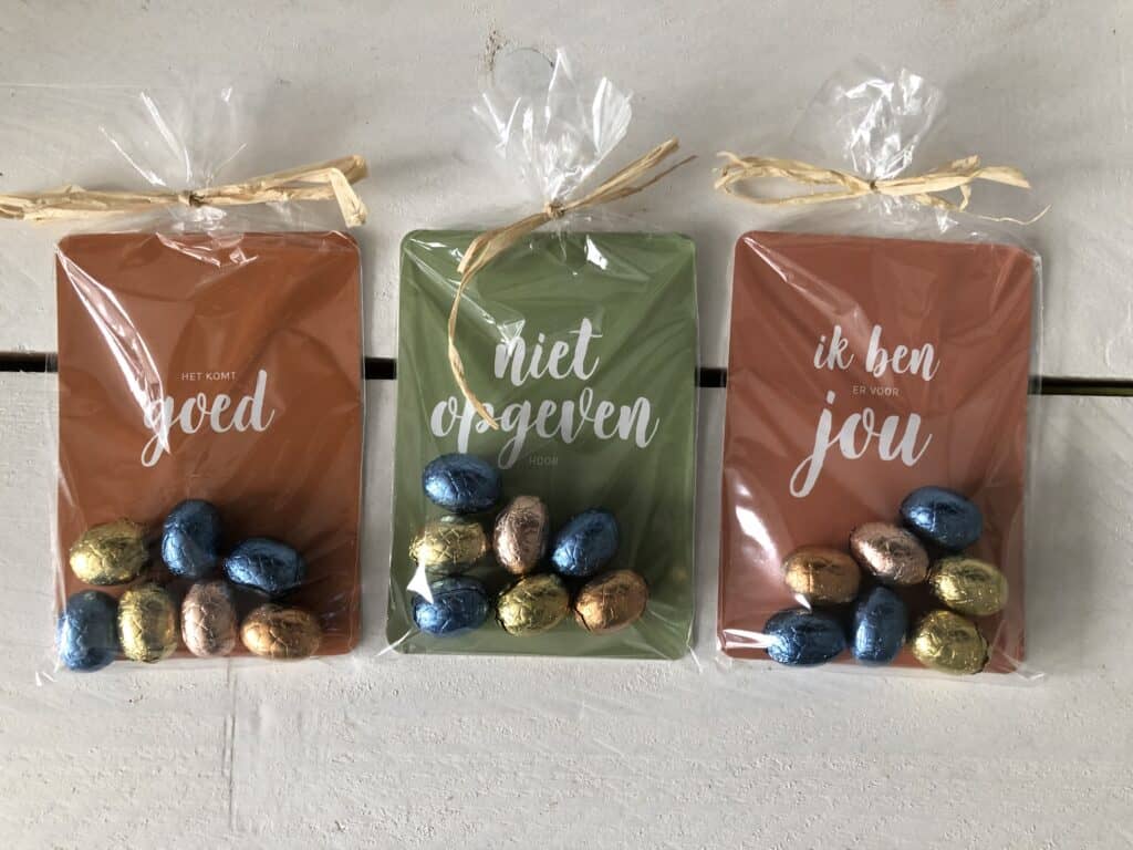 For example, you can use the cards to make a package for Easter with Easter eggs, let them know that you are thinking of someone. But also, for example, with a nice flower vase and card as a sweet gift. In short, everything is possible.